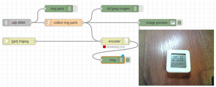 At the input, we have a UDP server that receives data from the camera. After this, we need to collect fragments of pictures into whole images. This is what the “collect img parts” node does.