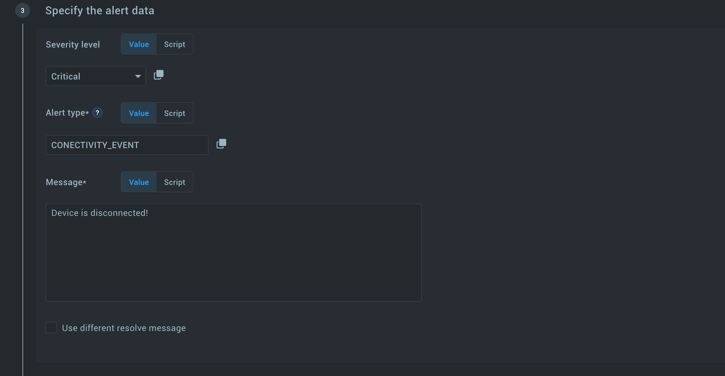 Severity: Set the severity level of the alert. It can be one of the predefined values that you can pick or write a script to choose the severity level based on the value. If you aren’t very familiar with JS coding, you can click on Show expression from the previous step and reuse it for the logic here.
