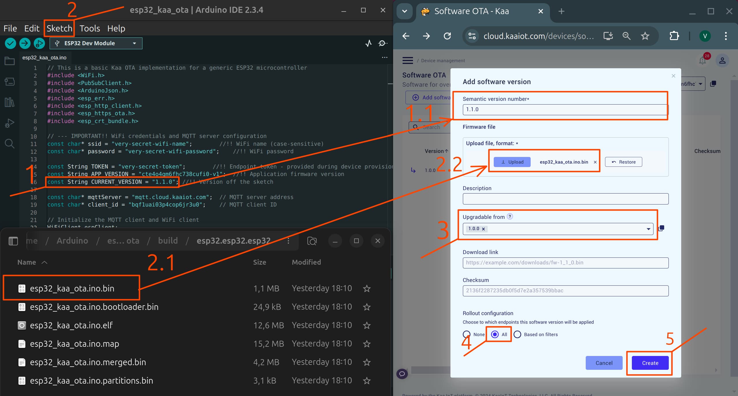 1.1.0 via Kaa UI, your ESP32, running the 1.0.0 sketch, will immediately detect this change and attempt to download the binary we compiled earlier to update itself.1.0.0 to 1.1.0.