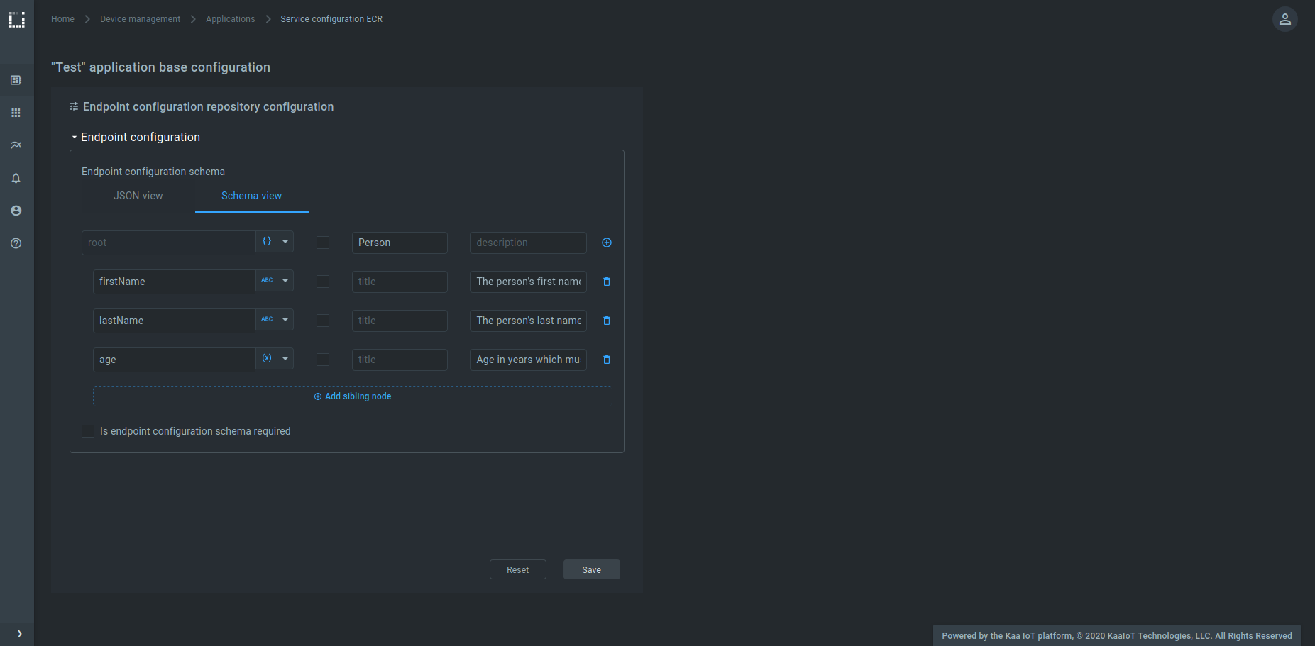 Endpoint configuration schemas can be configured for ECR in the Kaa Web Dashboard, either in the schema view: